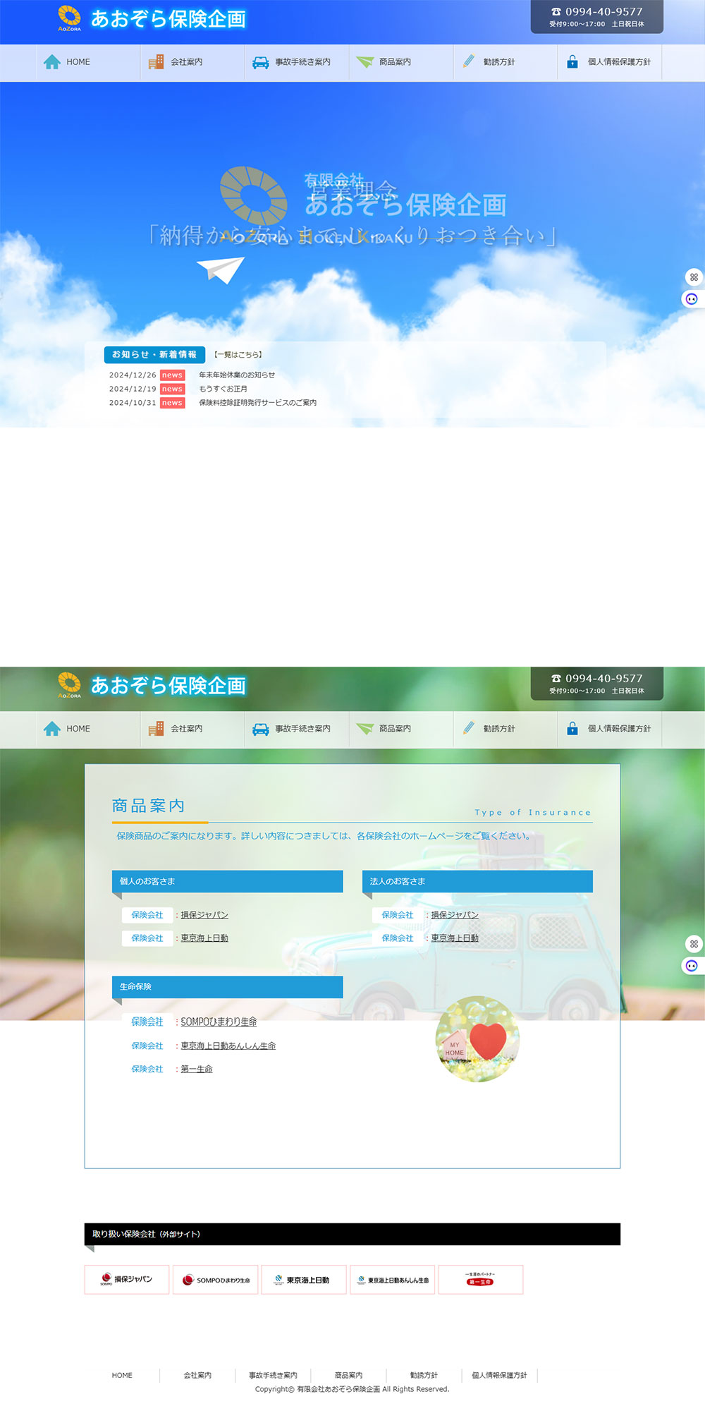 2022-08-22 2025-01-24 hamashiri あおぞら保険企画 業種保険会社開発HTML CSS JSURLhttps://aozora-hokenkikaku.com/備考鹿屋市にある保険代理店